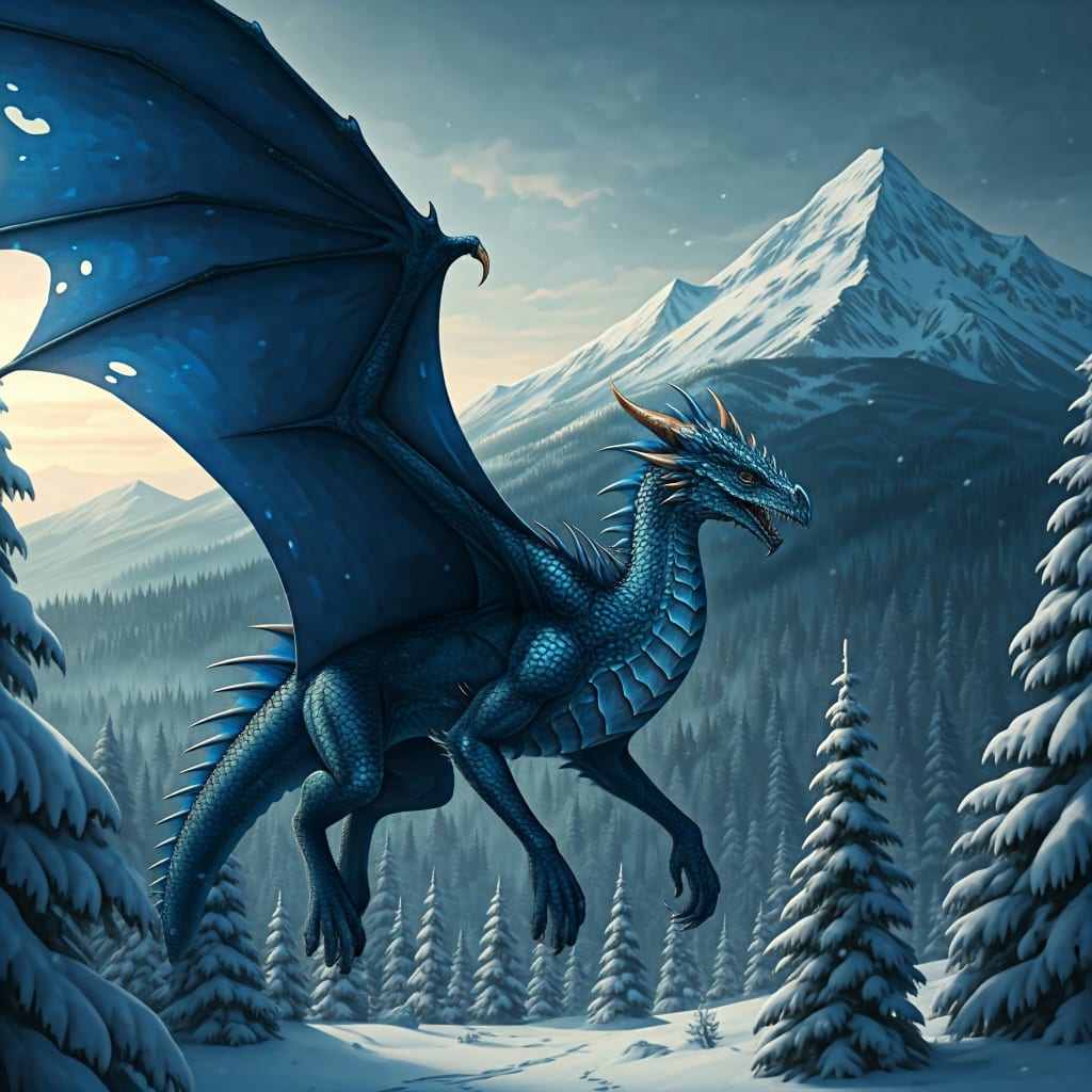 I soar over the trees, stretching my large, dark blue wings, as they glisten in the rays of the fading sunlight. I enjoy the feeling of the wind blowing across my scales and smelling the crisp winter air as I take a deep breath in. After 250 years of living, I've decided that winter is the best season and no one can change my mind. For me, there's not even the drawback of less food since I can just fly to another area, I think, as I begin my dive for the doe whose scent I caught on my inhale.