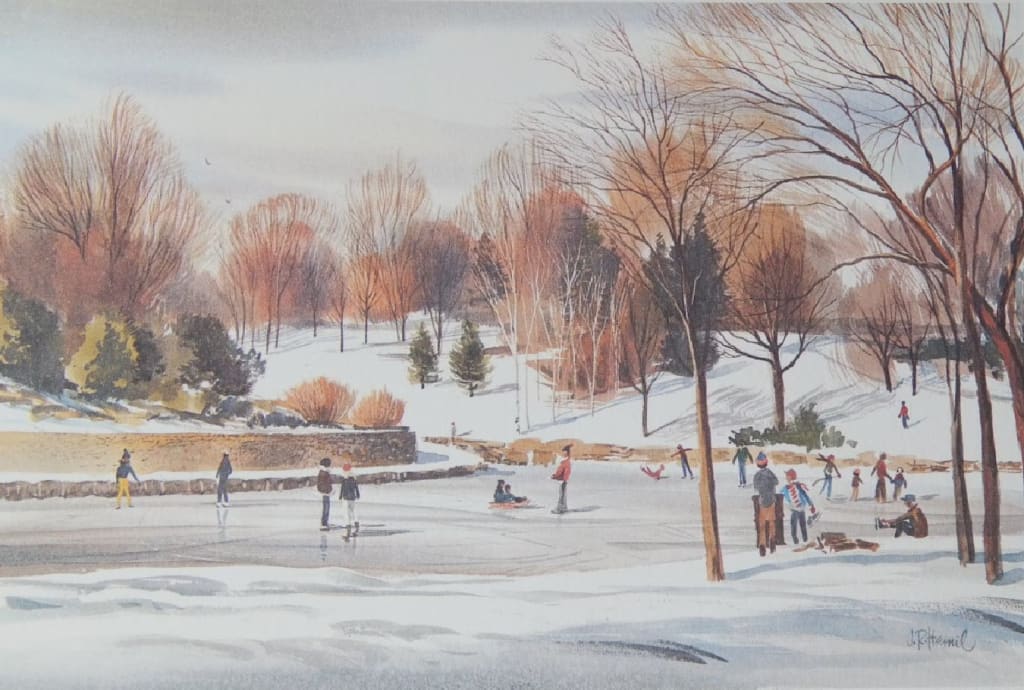 As he came around, you reached out and drew him in to skate arm in arm with us as we fell in step to skip our way on the skates back to the far end of the lagoon. Kicking our legs forward and gliding on, we returned down the ice, completing another lap. We returned to leaning far to the right and to the left, skipping, and drifted away, on to the back of the pond.