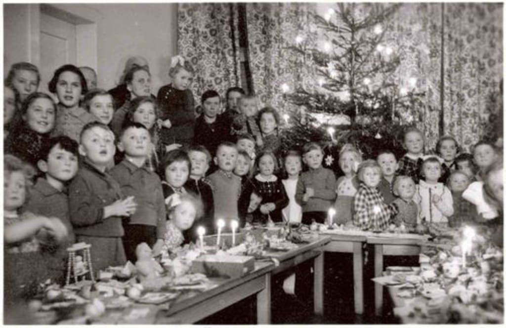 They celebrated Christmas with food on the table and smiling children.