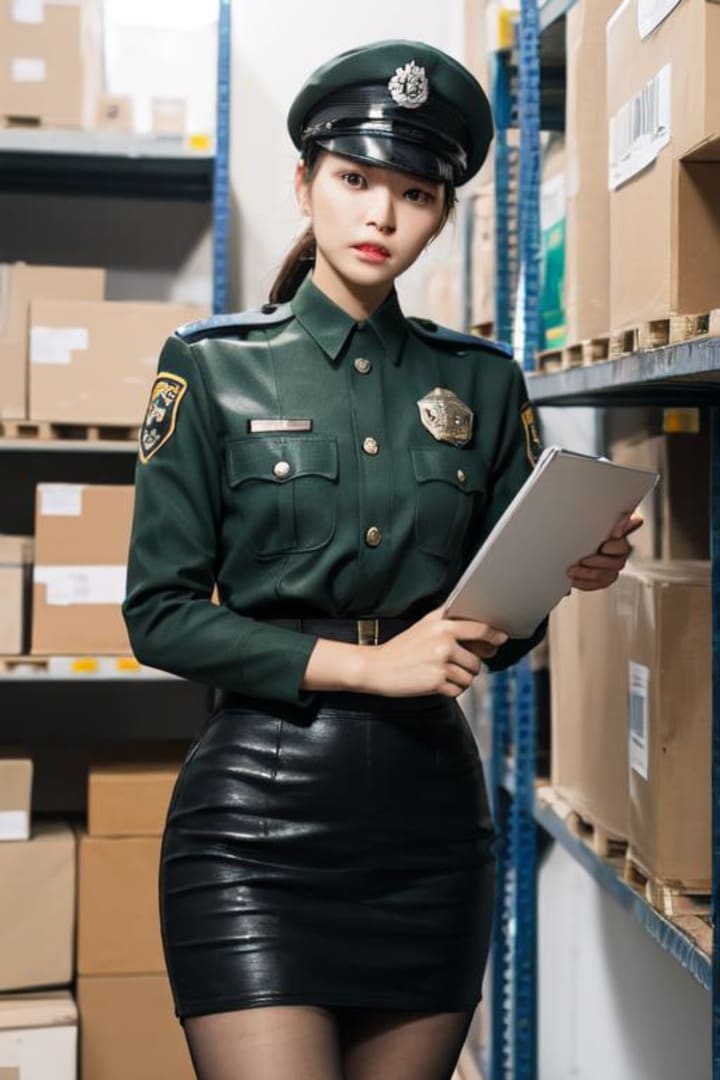In the cover of the night, the spy silently approached the heavily guarded warehouse, its exterior dimly lit by sporadic lamps. A group of female officers, clad in their distinctive green leather uniforms and skirts, patrolled the perimeter, their vigilant eyes scanning the surroundings. The spy meticulously observed their routine, waiting for the opportune moment.