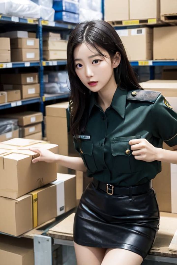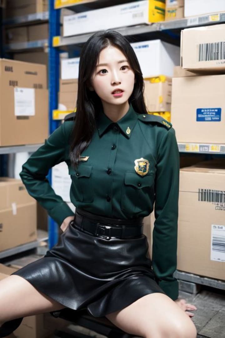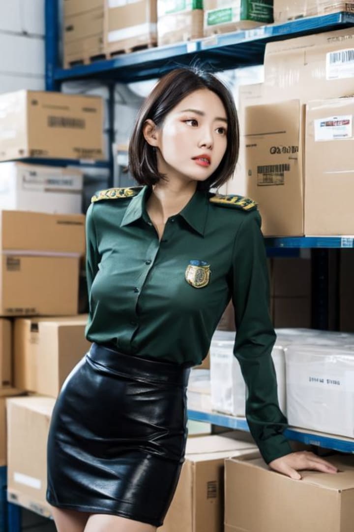 The spy surveyed the surroundings, ensuring that the coast was clear before dragging the unconscious officer to a concealed corner behind stacked crates. In the shadows, she began the process of changing into the uniform. The green leather clung to her frame, and the skirt felt restrictive as she fastened it around her waist. The jacket, while snug, bore the unmistakable scent of the officer she had incapacitated – a mix of leather and a subtle fragrance that lingered in the night air. She adjusted the collar and smoothed out the wrinkles, the spy became acutely aware of the unique sensory experience – the touch of the leather against her skin, the smell of the officer's distinct perfume, and the look of the uniform, now stretched slightly to accommodate her frame.