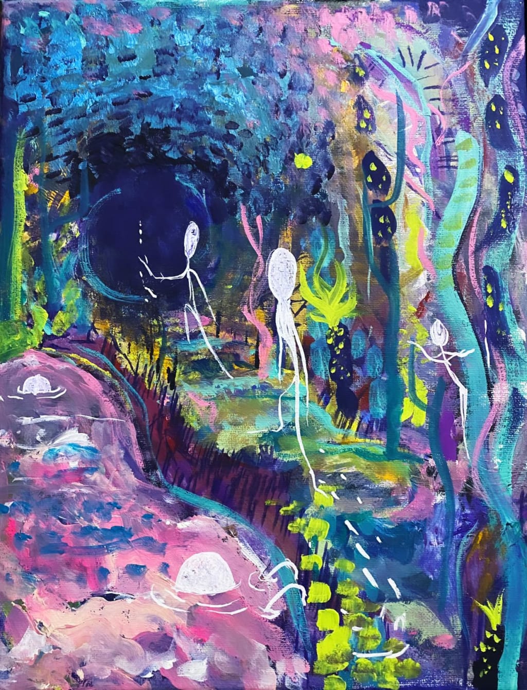 Please listen with headphones to the video above while reading. The original story and painting was inspired by the music here.