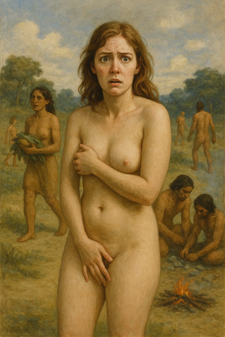 Mattie’s Moment of Dislocation had begun almost immediately - with the strange certainty that something was wrong with the air itself. It felt too open, too unmediated, as if the world had formed a new layer. When she pushed herself upright, the truth hit her with a jolt: she was bare - unclothed - naked as a new-born babe. Not just undressed, but returned to a particular state- as though time had folded back on itself and placed her in an age before fabric, before modesty, before the idea of “covering” had ever been invented.