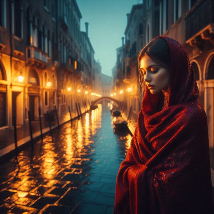 The rain fell gently on the narrow streets of Venice, casting golden reflections on the cobbled path where Emilia stood, wrapped in a deep red shawl. Her eyes searched the crowd, not for a familiar face—but for a memory.