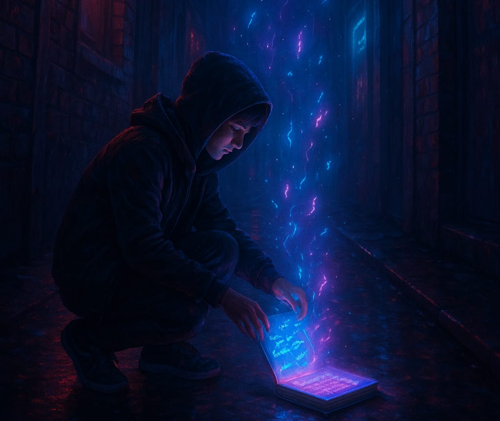 That night, after finishing a mural beneath a flickering streetlamp, Luca noticed something odd: a faint humming, soft and steady, like a neon sign breathing. It came from a small diary lying near a drain, its edges glowing with gentle pink and electric blue. The colors pulsed like a heartbeat, as if the book itself were alive.