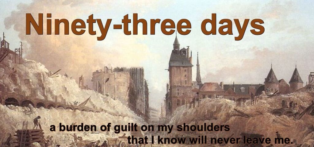 A few hundred paces from my enemy’s camp I am sighted and an excited buzz fills the air as I enter with my head held high. Men gather to get a closer look at me, and I am surprised I encounter little hatred in their eyes; merely despair. A pathway is created which leads me to a large tent, from within a small man with black eyes and a choleric face walks towards me. We have never met, but no doubt he has lived with a description of myself that my appearance satisfies. If he is happy, his expression does well to conceal the fact; with the slightest inclination of his head he directs my attention to the waiting gallows and the end of my resistance. He wants this over as much as I. Ninety-three days is much too long.