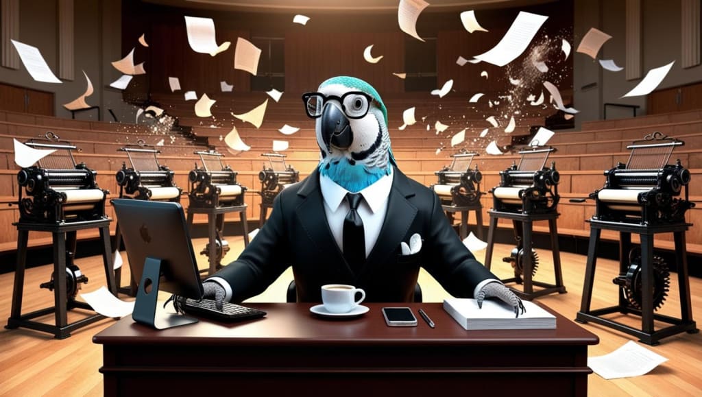 The typewriters sat in their places in the lecture hall, ready to race against time to copy every word the parrot said, no matter how important, trivial, or superficial. The brains of the typewriters were designed to write and record everything.