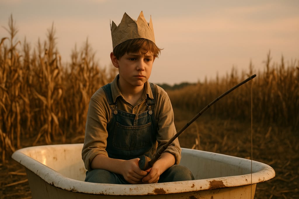 They found Billy at dawn, sitting atop a rusted bathtub in the middle of the cornfield, wearing a paper crown and holding a fishing rod—without a pond in sight.