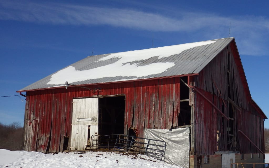 The heifers huddled together in their stalls, the winter sky peeking through pockets of caved-in roof. Heavy, wet snow piled at their feet.