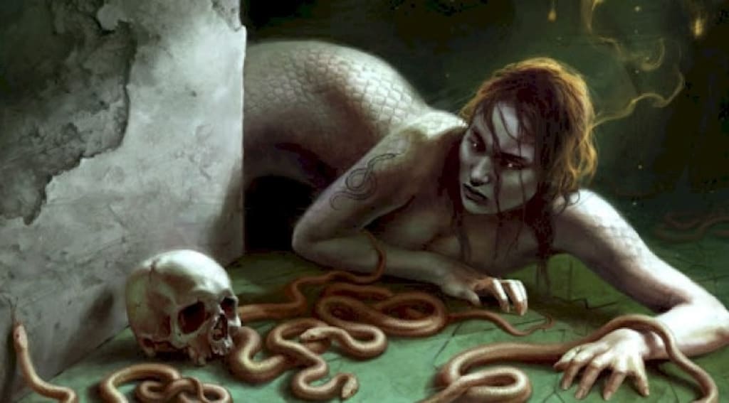The story of Şahmaran began before he was born. Her mother, a half-human, half-snake woman, was imprisoned in a magical rock by a sorcerer. The sorcerer had raped her to create a being that was half human and half snake. Given the fact that her mother, a snake, had the ability to mate, it was not surprising that the Shahmaran was created. But who was Shahmaran's father was unknown.