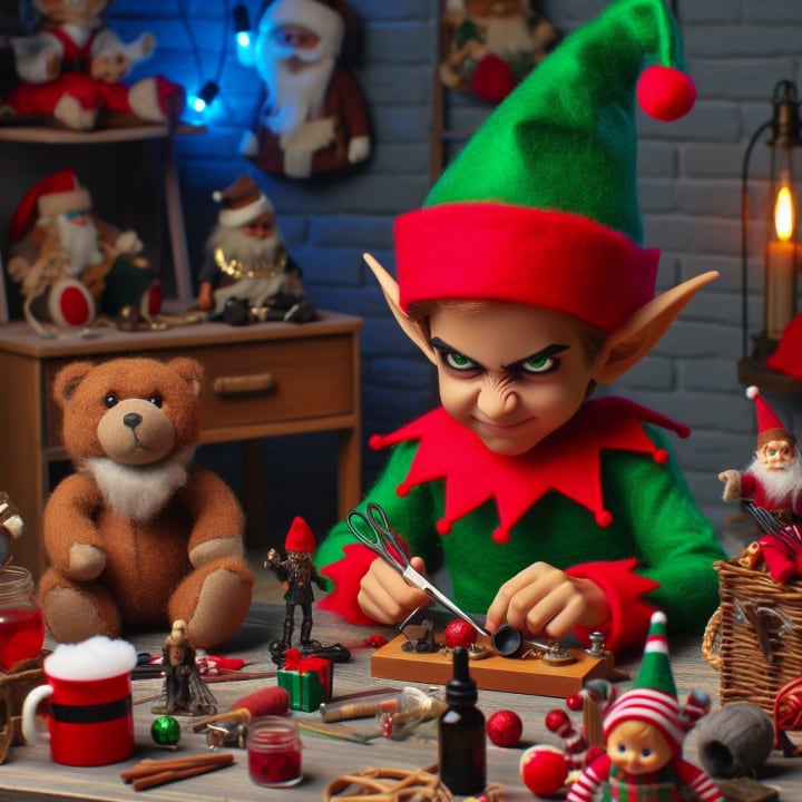The compulsive helper barely reacted. Santa fiercely grabbed the tools out of his hands. Elf looked up at Santa with a demented glare. In a single motion, he leapt onto Santa's bright red sweater and snatched the tools out his maker's shaky hand. He didn’t waste a second getting back to work. Santa again grabbed the tools but this time, he hid them behind his back. Highly irritated, Elf slowly turned around. He huffed and puffed while outstretching the open palm of his dwarf-sized right hand, gesturing for the bloodstained tools back. When Santa refused, Elf again jumped in a flash onto his sweater. With one hand, he clung on to the fat man’s suspenders while the other hand took a savage swipe at Santa's face. The old man reacted by dropping the tools to clutch his deeply reddened face that began to trickle blood.