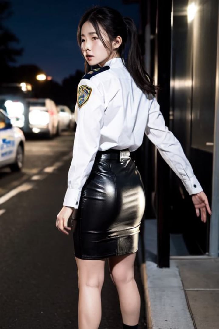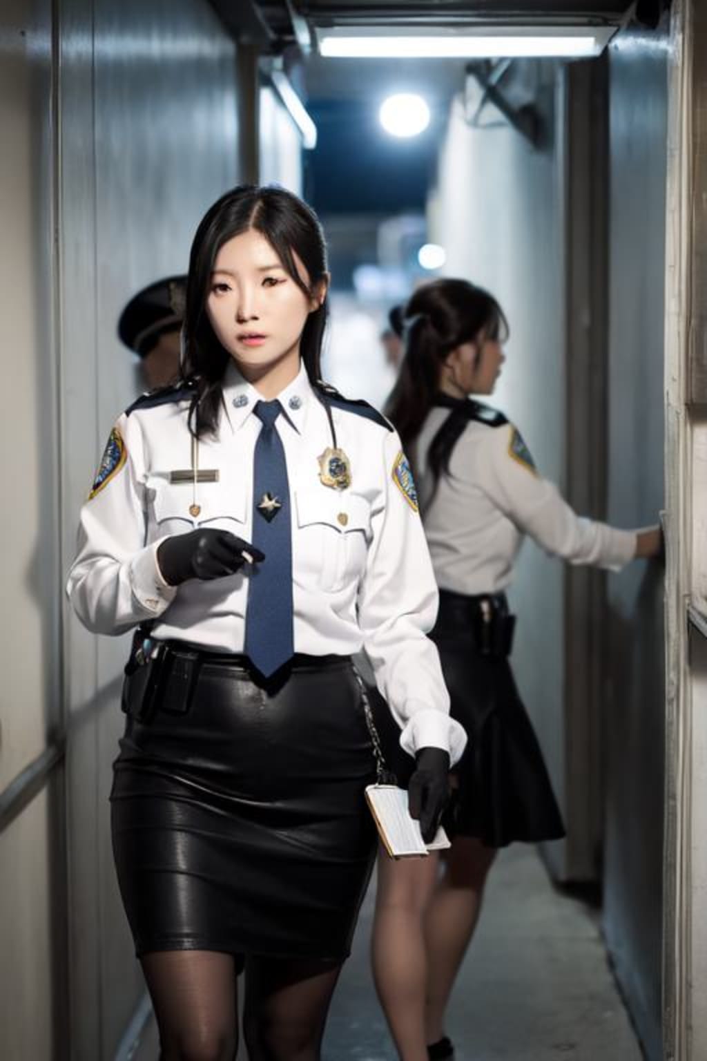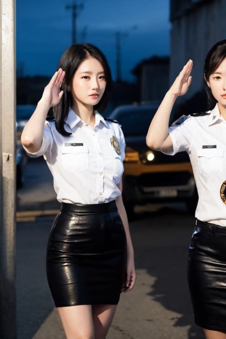 The faint glow of Officer Bennett's uniform beckoned to Valentina. She knew that to seamlessly integrate into the group, she needed the perfect disguise. Swiftly and efficiently, Valentina stripped Officer Bennett of her uniform, leaving her dressed only in undergarments. The white shirt, black leather skirt police uniform now adorned Valentina. As the stolen uniform clung to Valentina's frame as she adjusted it for a perfect fit. She glanced at herself in a nearby mirror, satisfaction evident in her eyes.