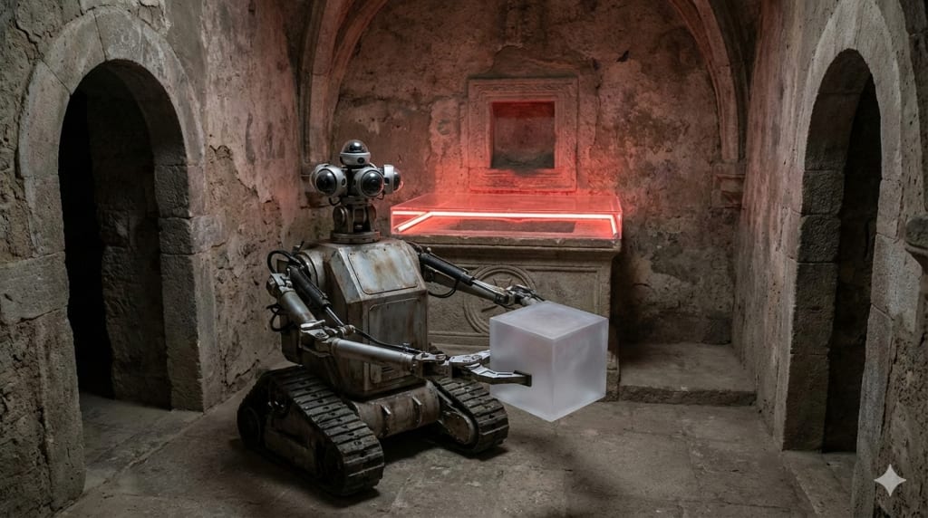 Running a quick diagnostics check, One found no deviations in its programming, mechanics or mobility. It was equipped with a variety of scanners, including CT and Neutron radiography that would embolden it for its task. It bustled forward stealthily on its treads. The hallway ended in the opening to the central chamber. One could see the other opening across the room. The polymer box which it had to acquire, lay on the dirt floor beneath the stone altar. One knew it was being tested on the dexterity of its limbs and pincers, and its ability to place an item in a designated location accurately. If it encountered any faults or flaws in its capacity to do so, it would adapt and repeat the task until it had achieved the desired goal.