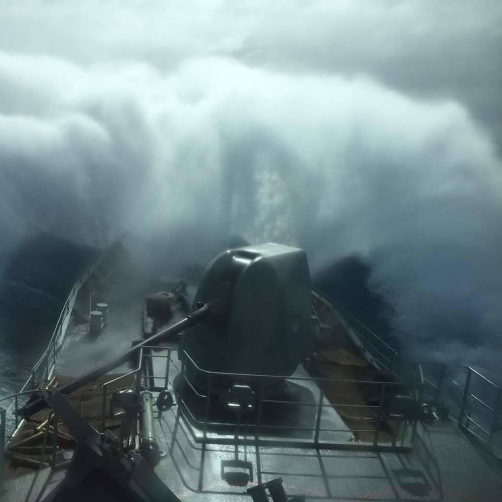 The ocean resembles a great undulating plain with the swells throwing the ship violently to its sides. The men inside this steel can are thrown with it, those that fail at an adequate grip on a nearby pole or table are thrown into bulkheads and hatchways, spilling blood and breaking bone. For thousands of miles the sea is empty save for this small vessel that dares to test the fortitude of the ancient sea gods. Each man knows full well that if the ship were to sink, if any of them where to fall into the sea, that no one is coming to save them, no one could come to save them. The sun sets and still there is no respite from the storm, in fact the wind has picked up and howls like a demon across the open decks. Doors that have been blown open now act as a reeve that gives the air a deafening whistle that makes communication outside impossible. Every man is wet, water soaking through cloth and skin, dampening their very souls. Water seeps through the pipes and joints as the bulkhead buckles under the stress of constant battering. The orders are given to repair the ship, long pieces of wood are pulled out from the holds to brace the bent inwards steel, watches are placed on these braces to ensure no movement causes them to slip and the hull to crack further, the newest sailors are placed on this watch, boys facing a half broken quarter inch thick steel wall, and oblivion waits for them on the other side.