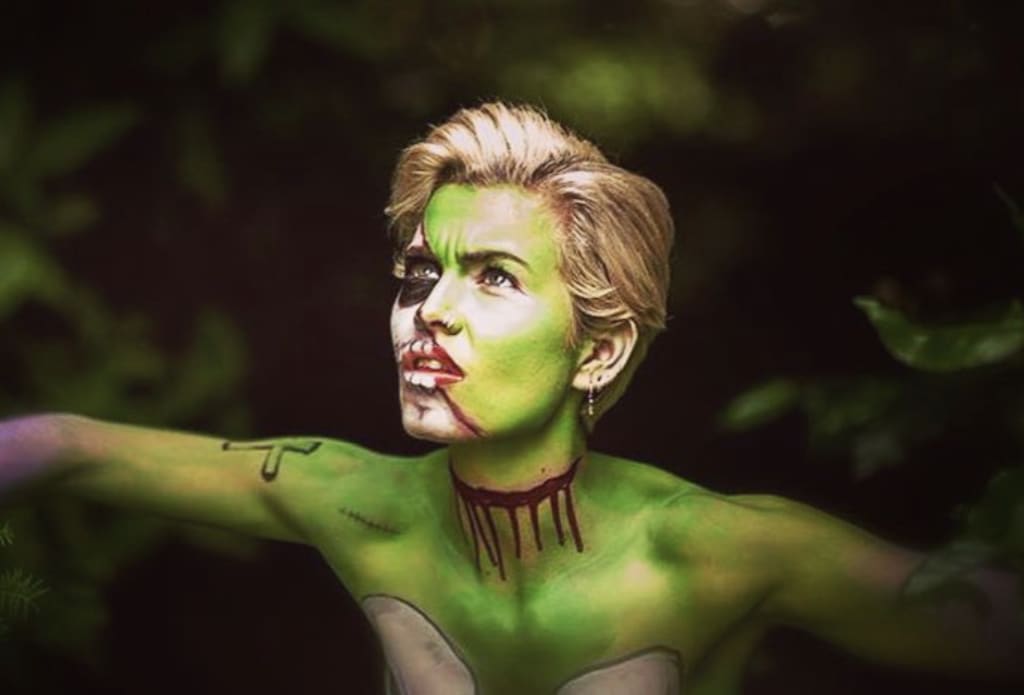 Late in the evening I was awakened by a scream in the camp. I sat up, startled, and found a woman sitting next to my bed. She was small in stature, had short blonde hair, and combed through it was the white lime paste that many of the tribes kept in their hair. In the candle light I could see where she had covered her skin in dyed patches of a greenish tint, a reddish ring around her neck, she wore a small looped piercing in her nose, and there were woad symbols drawn all over her body, symbols that were meant to give her unearthly power. Blood dripped off of her mouth and chin, and sanguine flecks caused by arterial spay covered her. She looked every bit like the demon that they described, yet through the gore and paint her captivating beauty was still apparent. She was both terrifying and lovely.