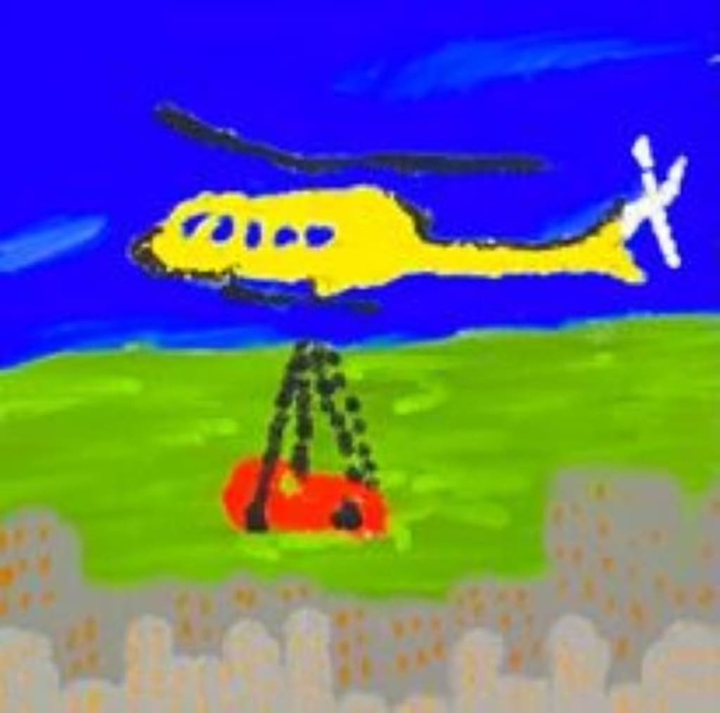 "Yes! Cheered the car." The helicopter attached a quick-release hook to the car and lifted the tethered car into the air. The car, while enjoying the ride thought for a moment and asked, "Why did you bring me up here again anyway; even though I lied to you?"