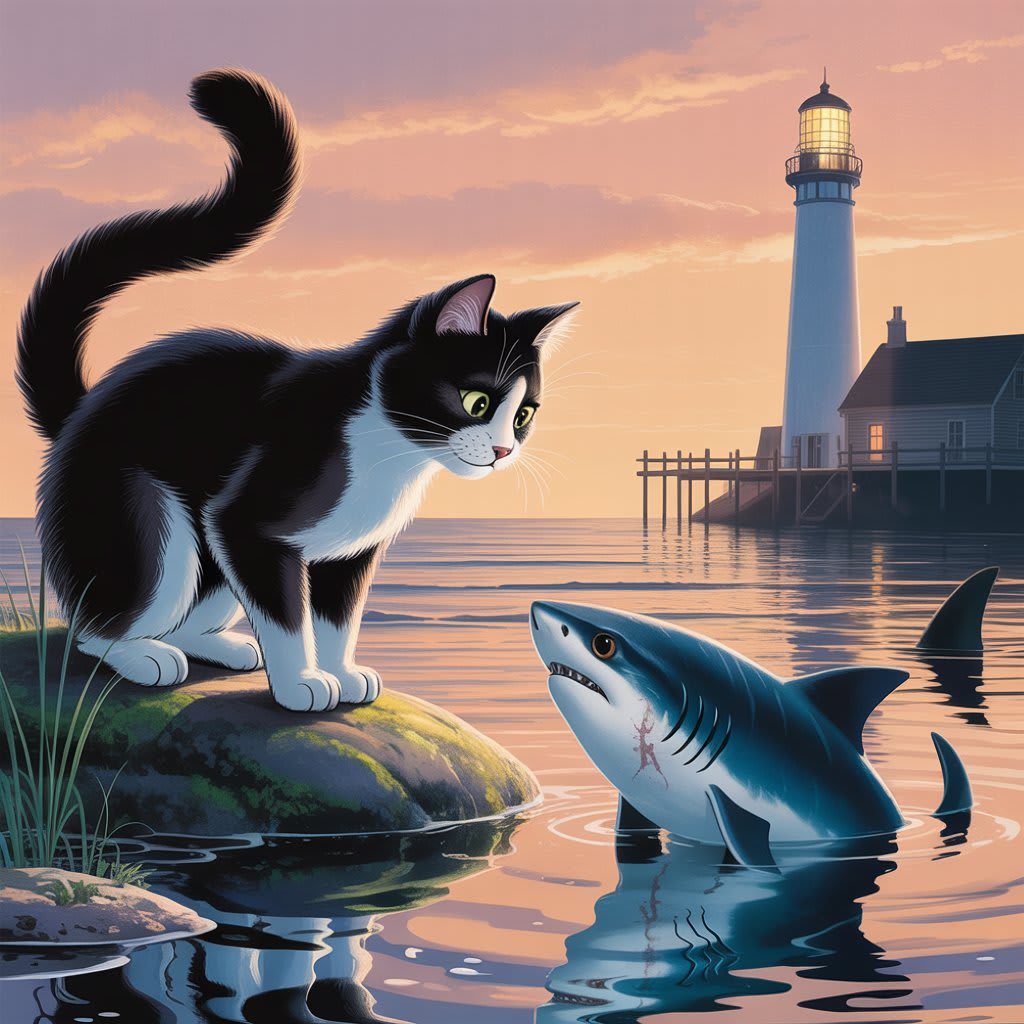 Years later, after Elias passed, a statue was erected near the docks. It showed a cat perched on a rock, one paw extended toward a cresting wave, a shark emerging from beneath. Tomas, now grown, maintained the site. And every year on the day Nami found the shark, the townspeople gathered by the sea, laying flowers and lighting candles, celebrating not just a story—but a truth.