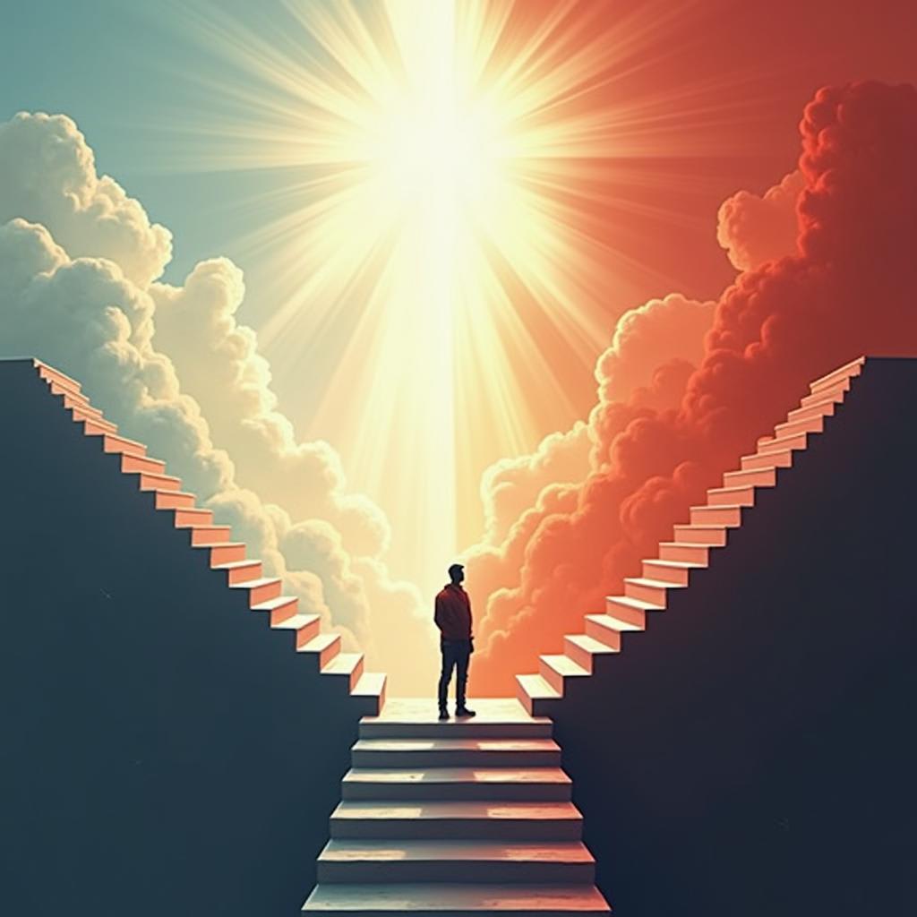 When consciousness returned, Manuel found himself in an infinite white expanse. Before him stretched two escalators, extending as far as the eye could see. One, pristine and white, ascended smoothly towards the heavens. The other, jet black, plunged into the depths.