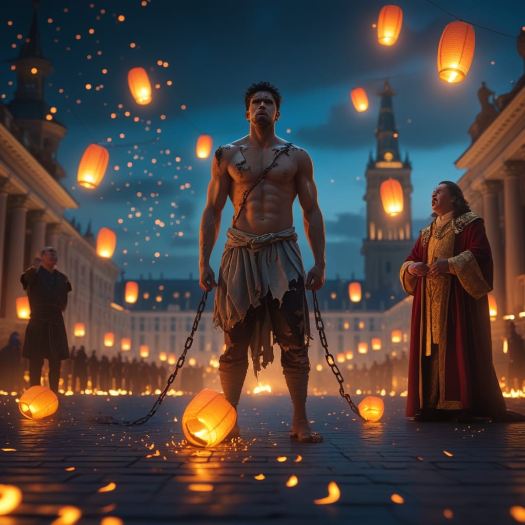 The lanterns swung low in the city square, their dim glow a futile resistance against the suffocating night. Soot clung to the cobblestones, whispering the remnants of old fires, of ash-strewn rebellions long snuffed out. In the center of it all, beneath the towering edifice of the Governor’s Hall, stood Marius Fane, his wrists bound with iron, his face a mask of bruises and resolve.