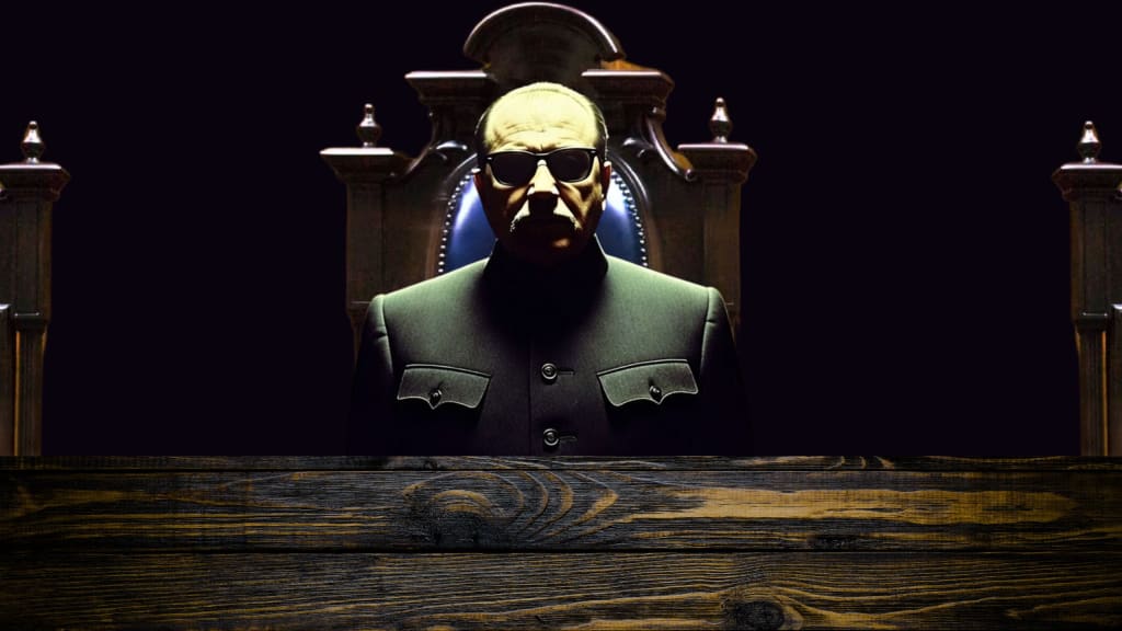 She wavered light-headed until the guard prodded her forward, bringing her to the center of the room where a cone of light marked the ground as the high platform arched around it. The high counter above held nine seats in total, and over each hung low lamps that cast crisp beams of light down on cold illuminated faces. She scanned each of their faces briefly until finally she fell upon the central judge. The lamp overhead lit up a stern and unmoving figure. An older man unknown to her, yet his face was vaguely familiar. Strangely, he looked to be covered in makeup, and his eyes were shaded behind dark sunglasses.