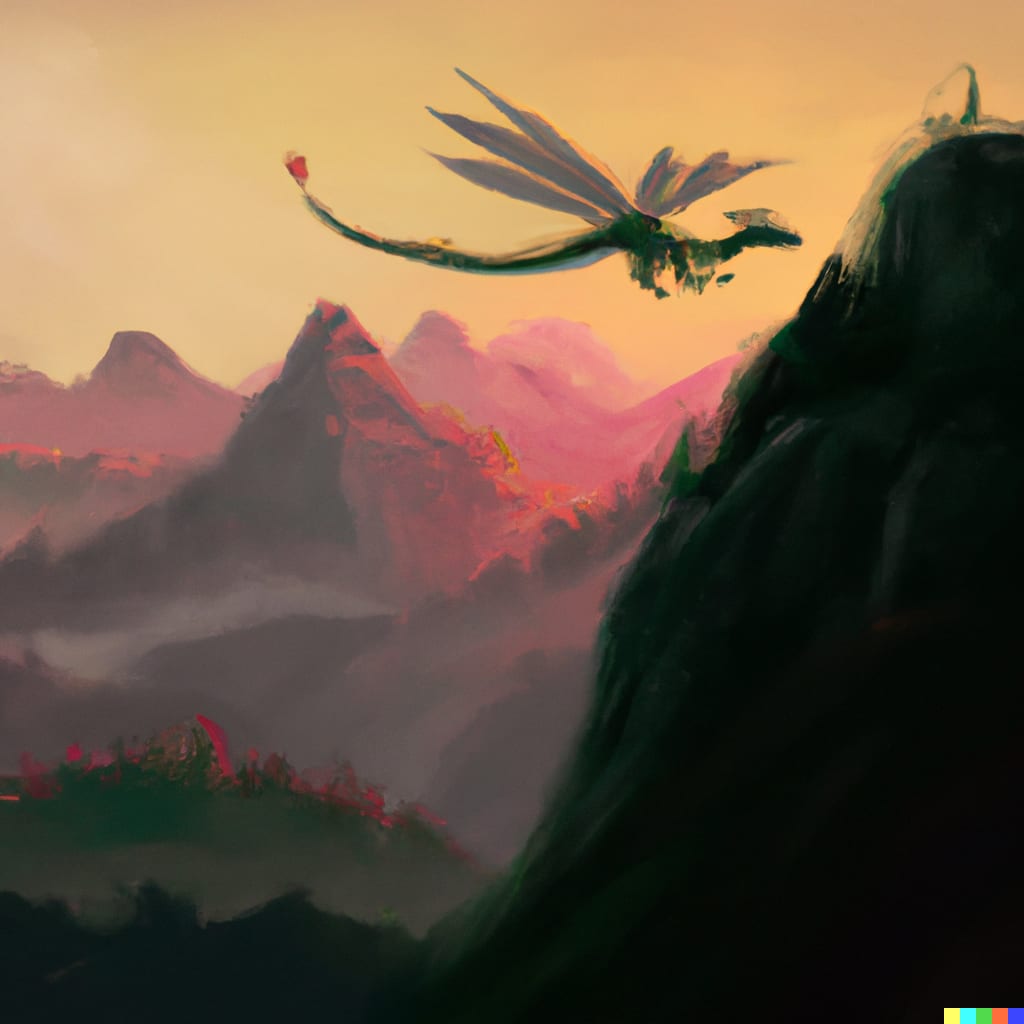 A night of walking later, Ezekiel the castaway dragon paused at the seam where forest met irrigated fields and peered through the pre-dawn fog to the hazy lights of a village he hadn't looked upon in decades. One night of balancing the boy in the depression between his neck and shoulder had left Ziek with a crick in the neck and severe paranoia. He hadn't noticed that the child had fallen asleep and slipped off his back for a few strides because he was too busy thinking about how suicidal his actions were. His thoughts went something like this: