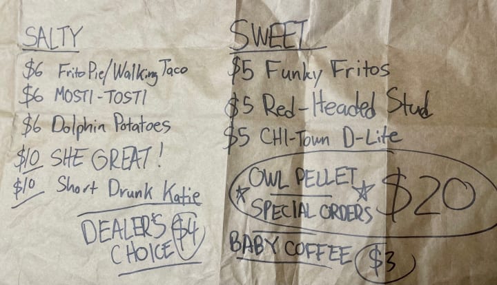 Brian also suggested three new options to the menu. "Dealer's Choice," "Special Orders," and "Owl Pellet." Dealer's Choice was always a dollar less than the next cheapest food item on the menu. If things got busy or crowded, the person taking orders would push customers toward it. Then Homer would decide what needed to move. Customers got a deal, and the slower selling items got sold. In quieter times, it gave customers a deal, and Homer used it as an opportunity to chat. He'd learn what they wanted, and he experimented with them.