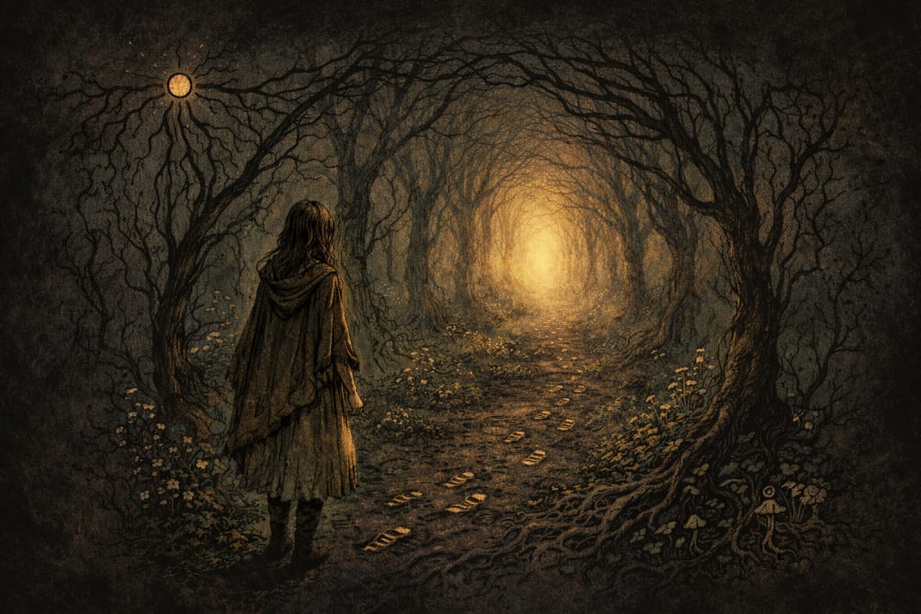 Surely there had been a trail just seconds ago; she had been following something to be this deep in the Forest. But now only sparse patches of dirt showed between thick tangles of weed and bracken, and she could neither find the path nor entirely remember if there had ever been one.