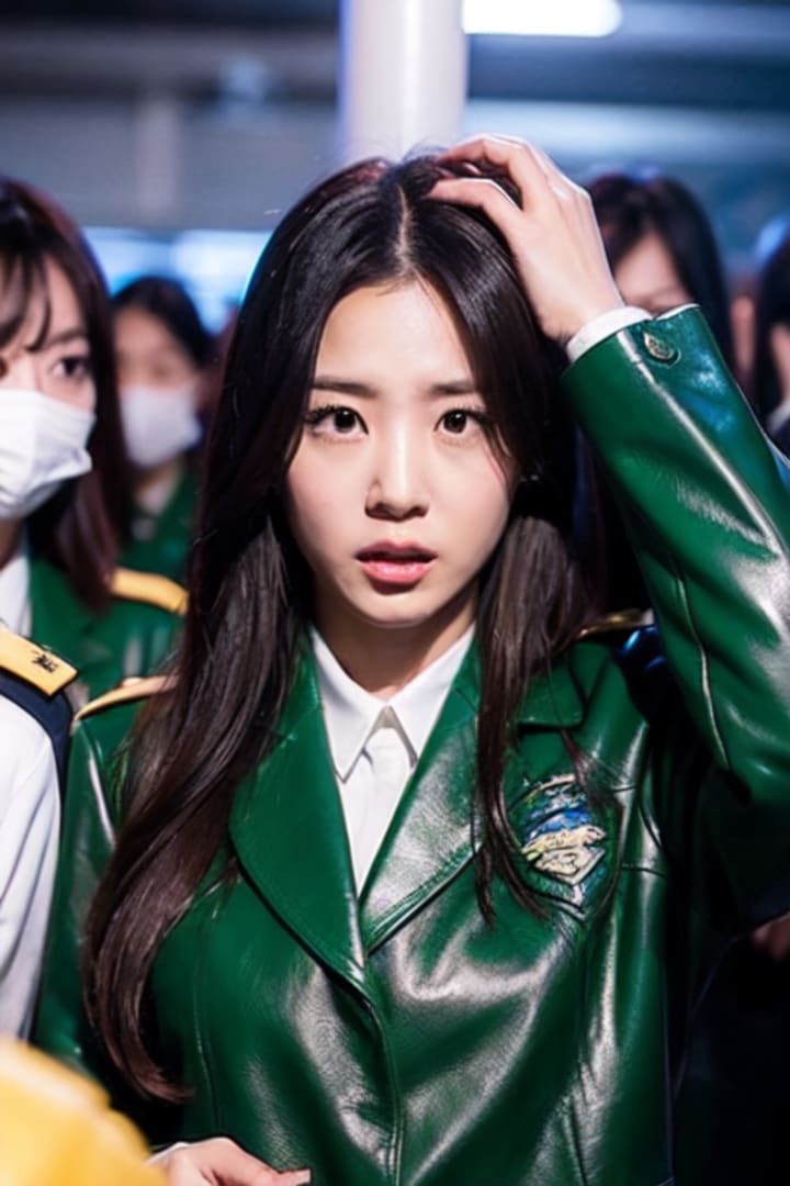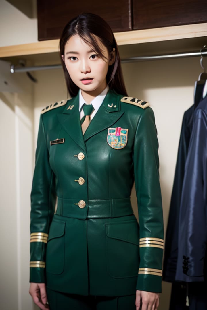 Inside the dimly lit closet, Emiko quickly assessed its contents. She found a spare green uniform tucked away on a hanger, along with a spare identification badge. With a mix of relief and determination, she swiftly changed out of the stolen uniform and into the new one. She adjusted the badge to display her new fabricated identity.