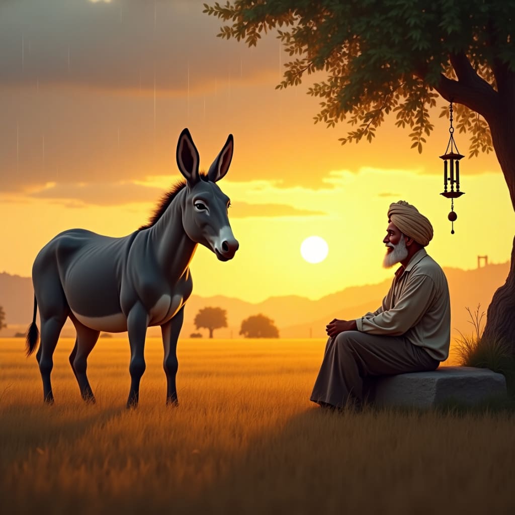 In the peaceful valley of Chandpur, where golden fields rolled like waves under the sun and birds sang morning hymns, lived a donkey named Kallu. He was a strong, quiet creature with shaggy gray fur, long ears, and the calmest eyes in all the village.