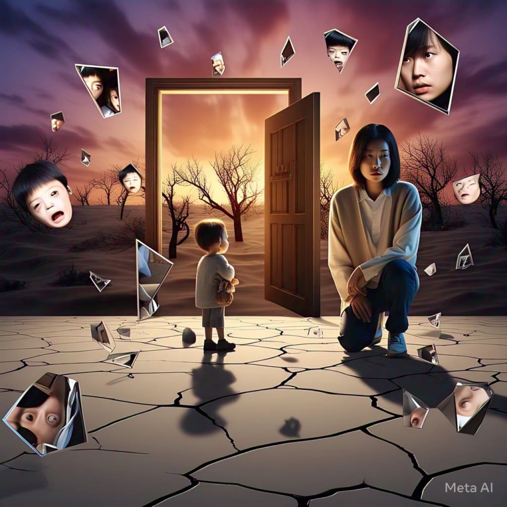 Suddenly, I was in a vast cathedral of mirrors. Not the elegant kind—these were broken, jagged pieces suspended in air like shards of a shattered sky. Each fragment reflected a different version of me: younger, angrier, lonelier, high-functioning, hollow. Some wept. Some raged. One just stared at me, eyes flat like pondwater, lips sewn shut.