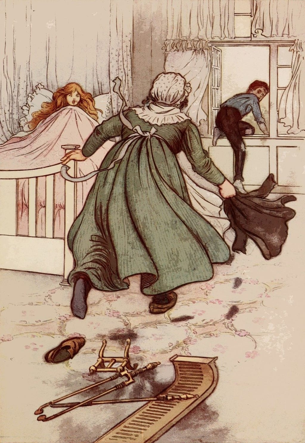 Nanny looked at the mess the boy had created sliding down the chimney and groaned. She rang the bell for the housegirl to come upstairs and clean the mess up.