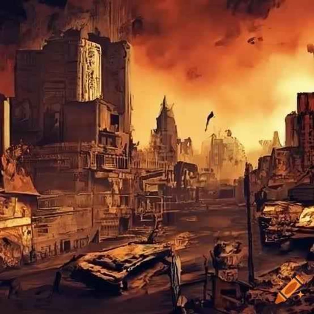 The smoke-filled sky cast an eerie orange glow over the desolate landscape. Crumbling buildings and abandoned vehicles lined the empty streets as far as the eye could see. This was all that remained of the once-thriving city.