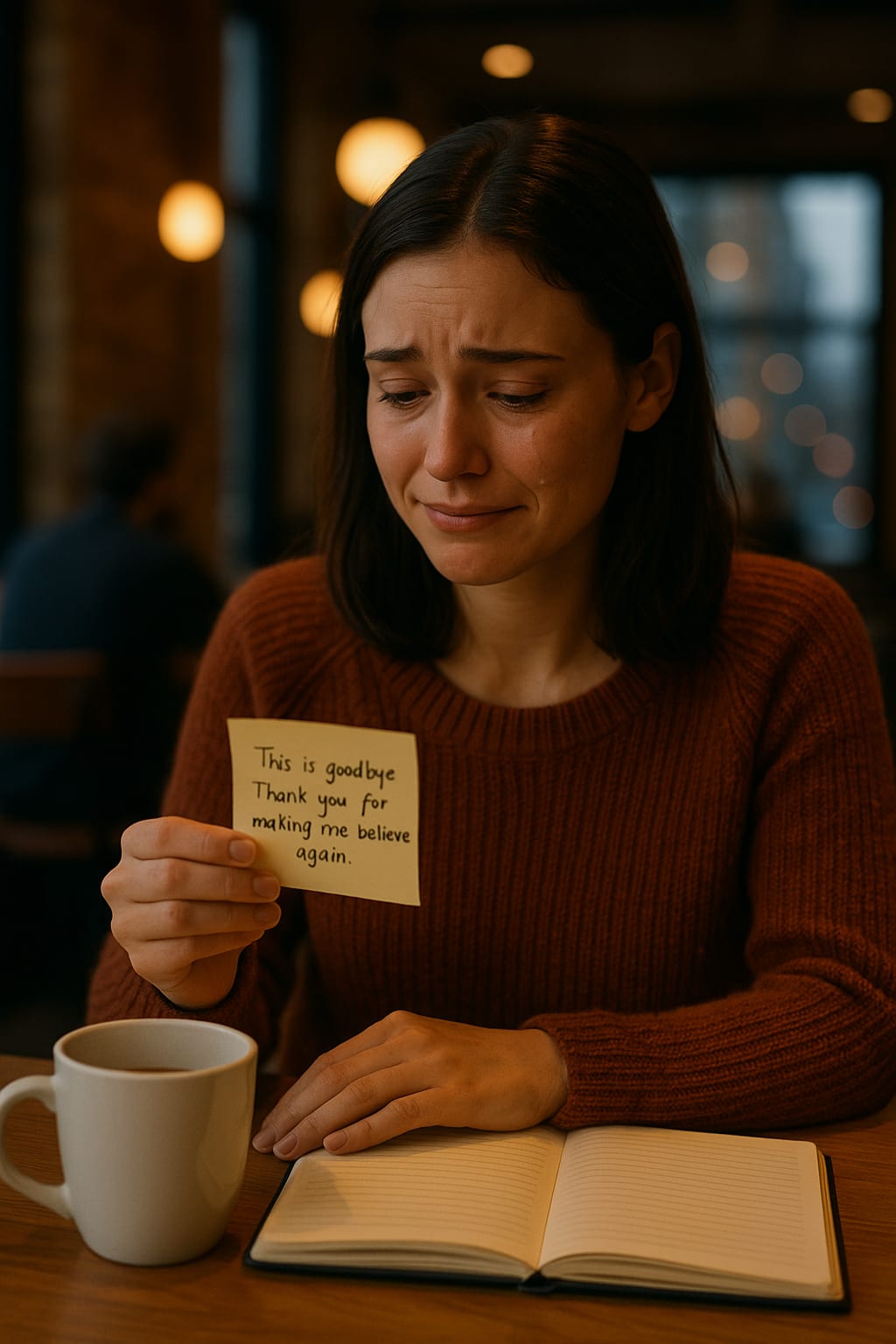 “If you see this, meet me at Café Azure next Thursday at 5 PM. No names, no questions. Just one real conversation.”