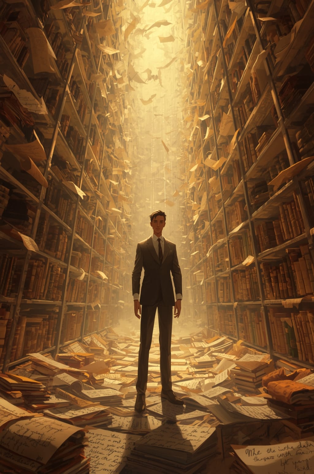 Within was a corridor of unimaginable dimensions. Shelves rose above his line of sight, packed not with books but with envelopes—vast numbers of them, meticulously arranged and softly illuminated as if concealing mysteries. The scent of ink and aged paper filled the air