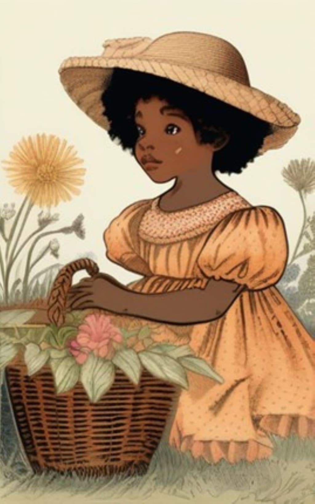 In a faraway rolling hill countryside, there is a three point mountain range adorned with beautiful foliage, blooms, and savory grass. Crisp white gargantuan clouds paint a scenic backdrop to the three point mountain range, and an incessant fragrant aerial mist of warmed lavender and jasmine encapsulates the three mountains. Within this mountain range dwells a little girl. The little girl has black poofy ringlet curls, skin like warmed brass, wears a dainty frock that flows even in the slightest breeze, a perfectly woven straw hat is affixed to her head, and nestled tightly in her left arm is a wicker basket filled with blooms and savory grass.