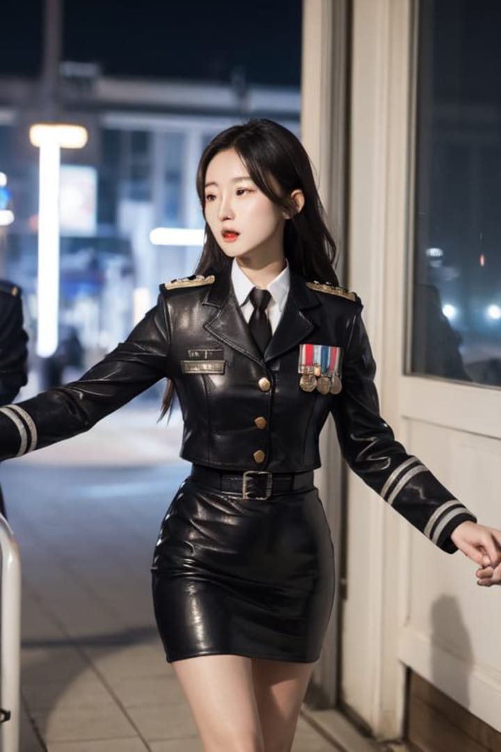 In a city pulsing with power and secrets, a prestigious event was underway, and it was the duty of a special unit of female officers, dressed in their sharp black leather uniforms, to ensure the safety of the VIP attending. Amongst them was Officer Valerie, a seasoned and highly skilled member of the team.