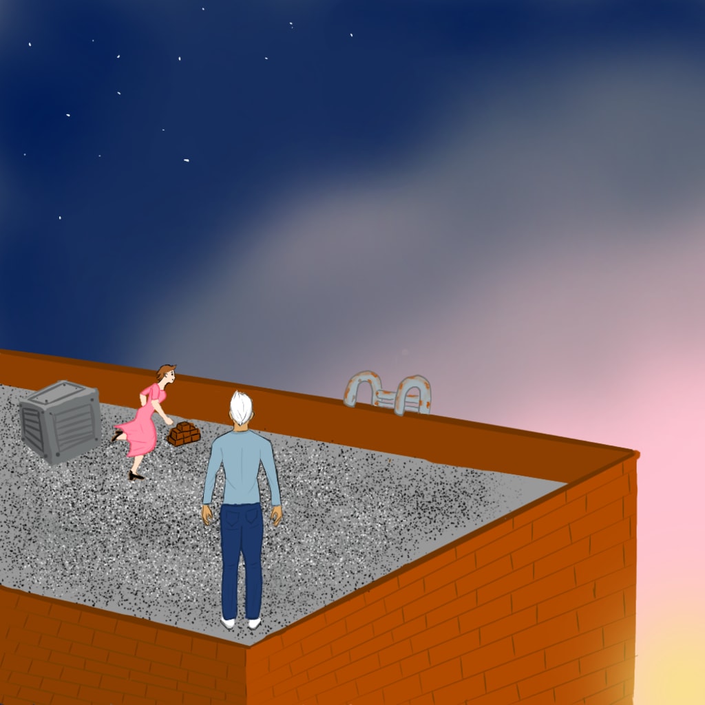 Eventually the potshots coming from below them ceased, and a minute or two afterward both of them collapsed onto the flat, gravel roof of the four-story building. Danny let Penelope just lay there like a rag doll to catch her breath and ran ahead to open the roof access door. He knew for a fact it was kept unlocked on purpose, as several teachers and even a few older students liked to sneak up there from time to time for a smoke now and again (even though tobacco was supposed to be banned from campus). Still, the heavy steel door was known to be stubborn and hard to open at times, so he surmised he would have it open by the time Penelope recovered from their harrowing climb. As predicted it finally opened after a few sharp tugs with a loud, bass groan, just as Penelope was getting to her feet again. Danny propped the door open with a few loose bricks stacked up near the air conditioning units, then ran back to help her. "See?" He said, doing his best to smile, "I knew ye could do it. Are ye ready to run, or do ye need me to carry ye?"