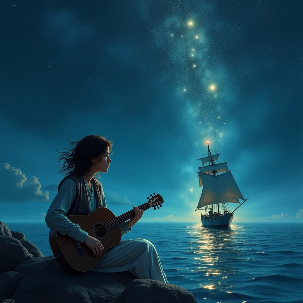 With Kael as her guide, Lira set out on a voyage across the ink-black ocean. The Celestial Lyre was their compass, its melodies guiding them through the darkness. As they traveled, Lira learned to play the harp, each note summoning a fragment of the lost stars.