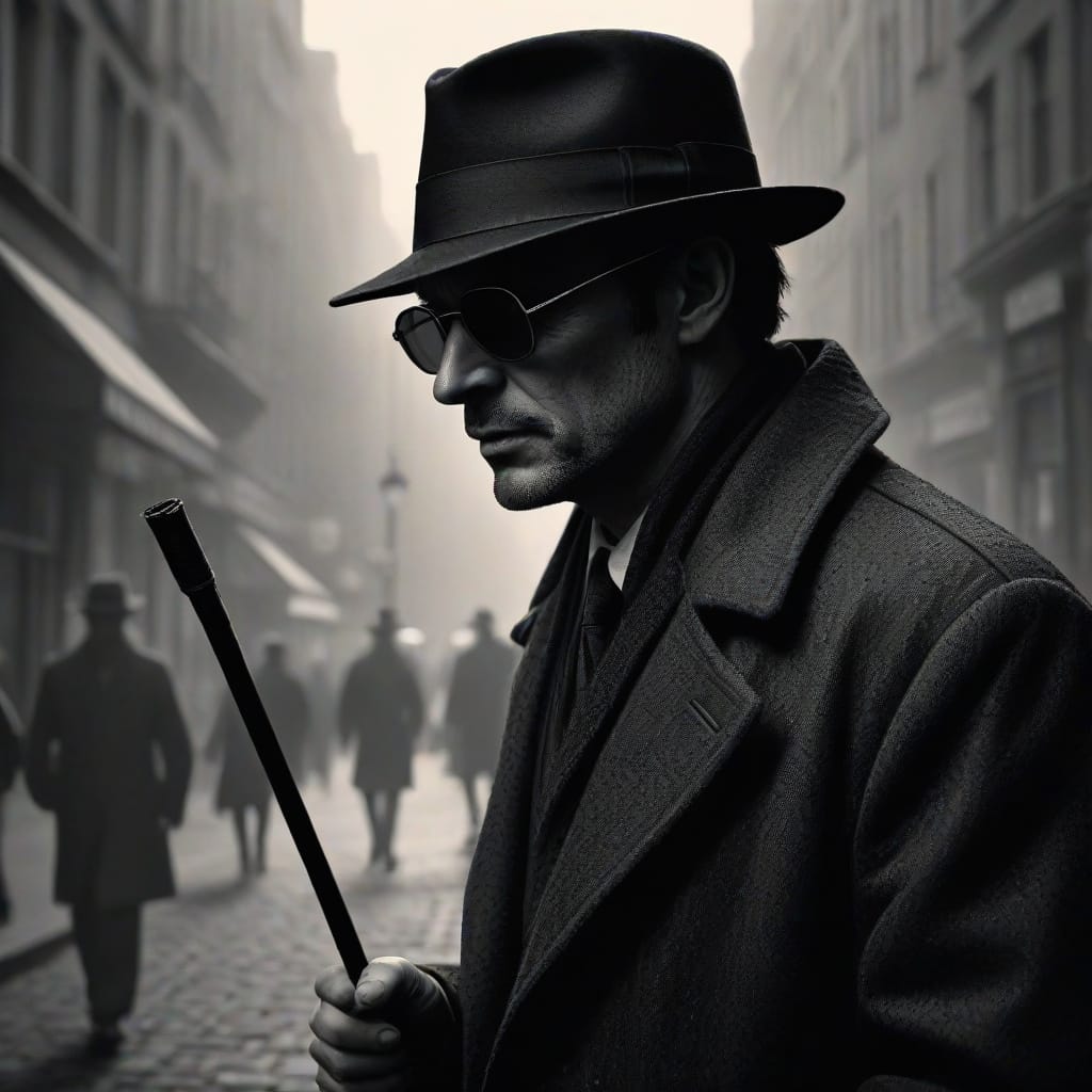 I see a man every day. He has a walking stick, a black coat, dark glasses and a black shapeless hat.