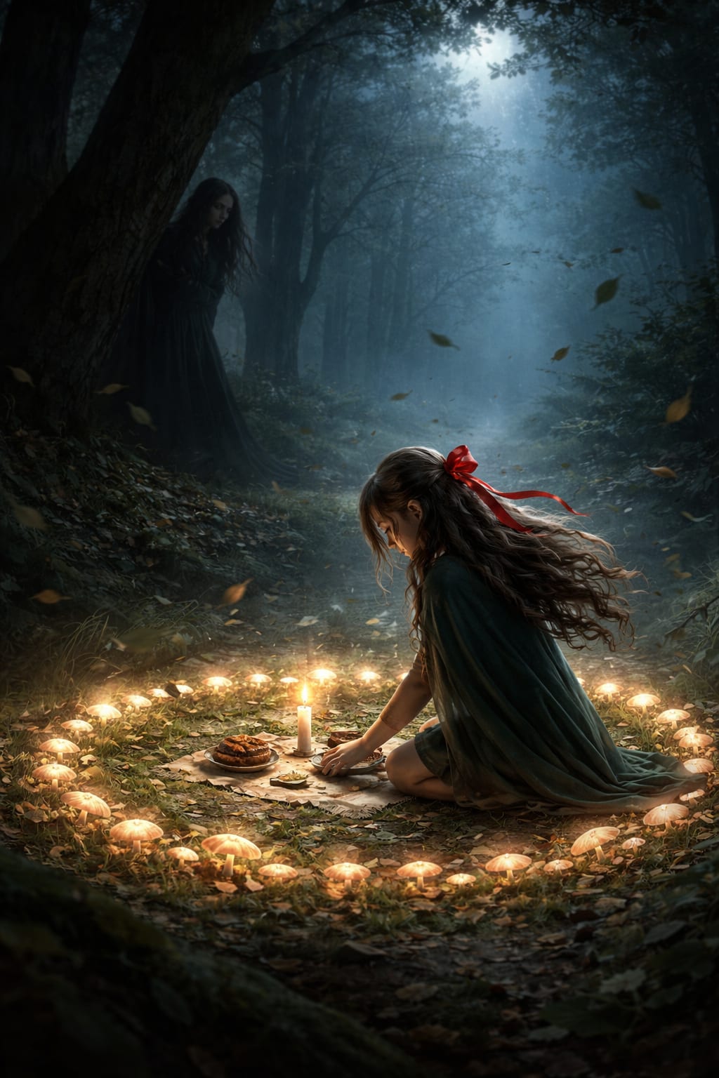She stepped into a mushroom circle, laying out her offerings: a small blade, a fragrant slice of something like chocolate cake, and a tiny bone—maybe a tooth. Her hands were steady, precise. Yet she lacked the wisdom of the forest, of the craft. Her intent was true, but technique alone could not bend the fey.