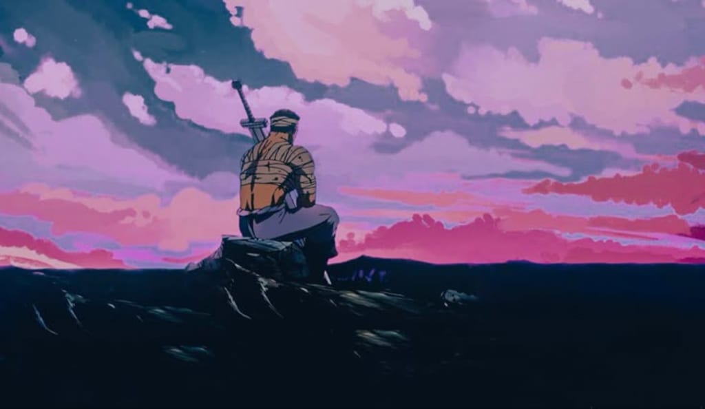 The sky above him was a violent kind of beautiful, a mixture of pinks, purples, and the last desperate blues of daylight. The sun didn’t set here; it bled out. And he sat on the cliff’s edge, his sword stabbed into the ground beside him, his bandaged hands resting on tired knees. To anyone watching, he looked like a hero resting. But no one was watching.