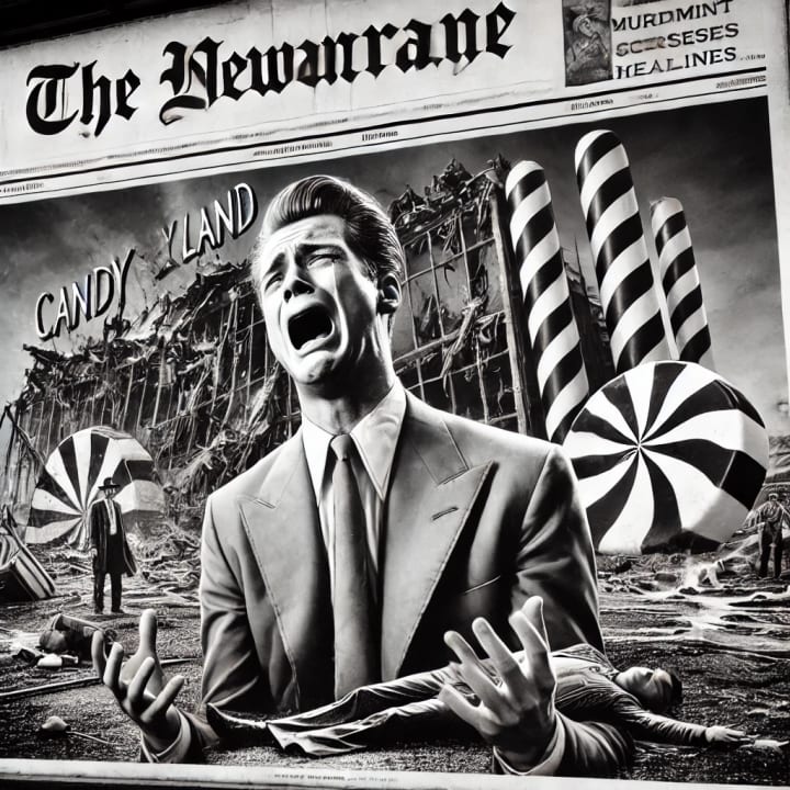 The screen cut to drone footage of the wreckage—twisted beams that used to be peppermint poles, the burned husk of what had once been a chocolate fountain, melted gumdrops sinking into the ash like tiny, colorful gravestones.