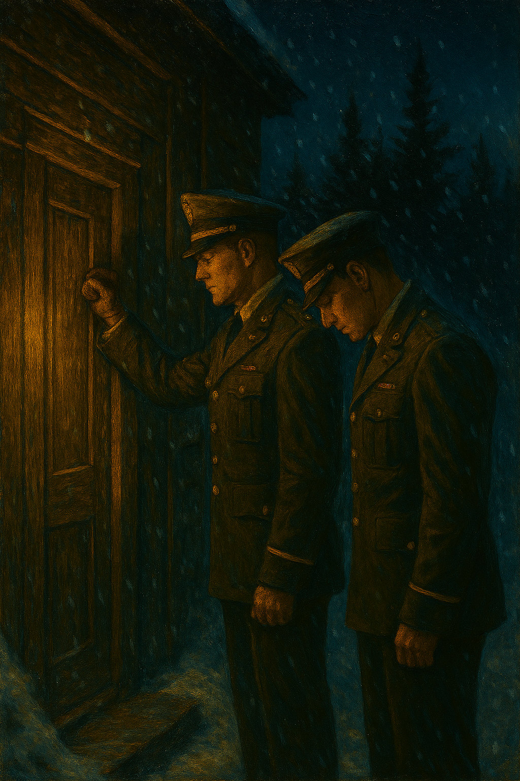 The door creaked wider, warm light spilling out onto the snow like the offering of a fragile lifeline. Ida stood in its glow, her hand still on the knob, her eyes locked on the two men before her. Their uniforms were immaculate, their expressions the epitome of solemn duty. One held a folded paper in gloved hands. The other cleared his throat, the sound brittle in the cold.