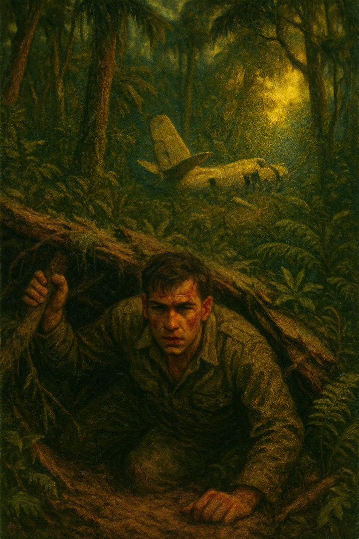 Hoping beyond hope that he could arrange a hiding place before whoever was coming got to them, he hurried back to the plane, making trip after trip. He got the guns, flashlights, all the water he could carry, dehydrated food, and easy to eat meals that he could salvage and shoved them inside the shelter. Finally, he covered the whole area over with fallen tree limbs, climbed under and waited.