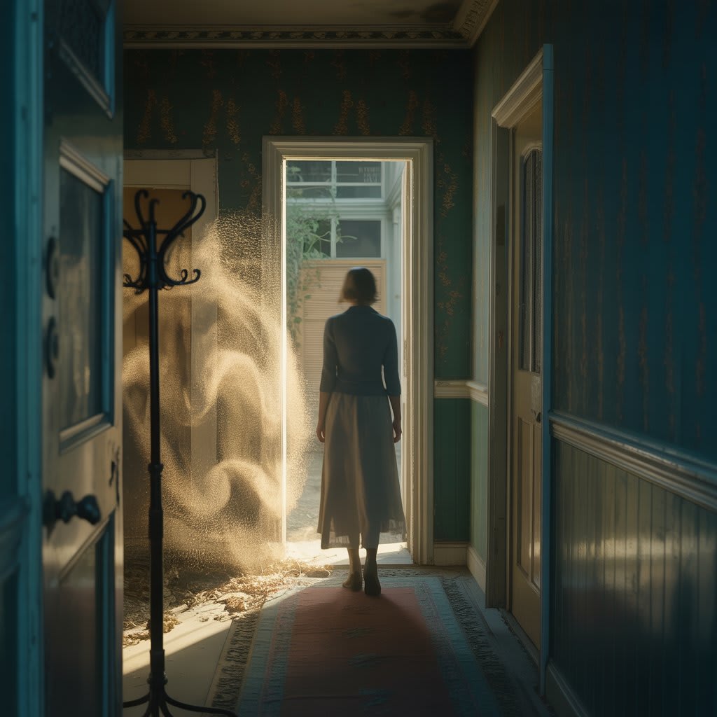 The house is different, smaller, with fewer things she touched. But the candle burns. The old record plays a soft crackle. And outside, the wind moves like someone walking without sound.