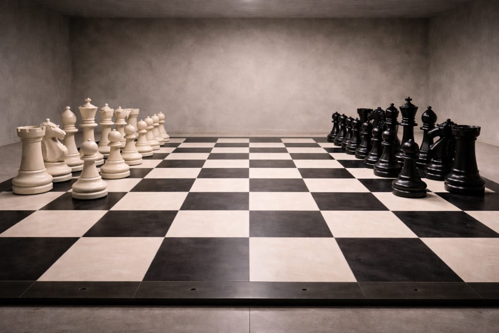 In the center of the room is a board set into the floor. Black and white squares. Perfectly even. A chessboard large enough to stand on.