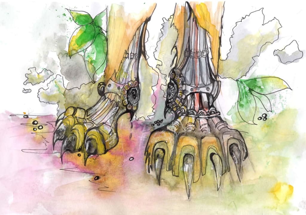 One metal hoof grinds steadily against the stones and rocks beneath me, turning it to dust and I smooth my hand against the spot between the two horns, bending towards its head; breathing with the hiss of the pistons I sigh.