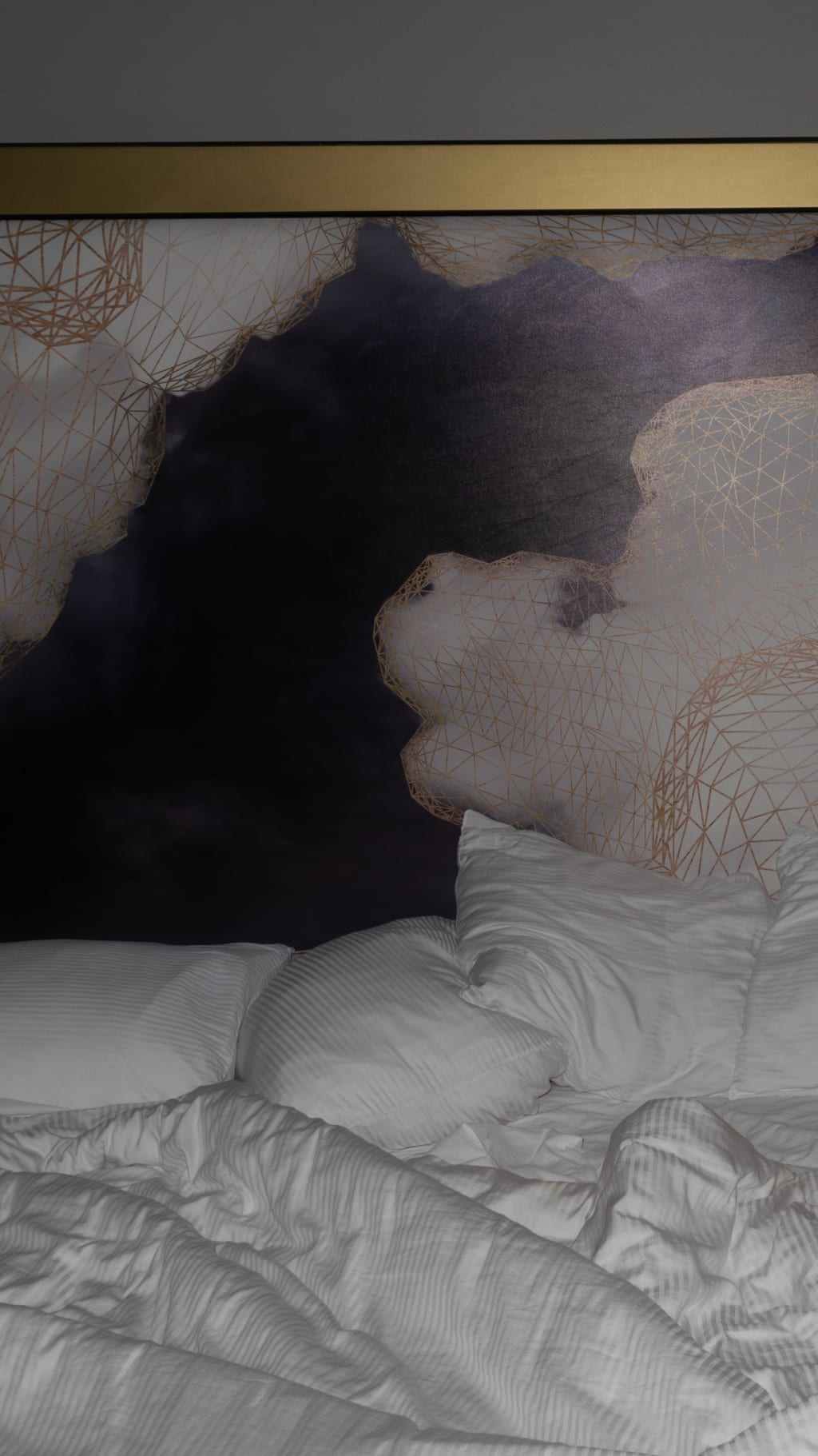 “Oh man...” He strains to roll over. Bringing his numb limbs flat onto the bed. “Shit.” He rubs his temple, blocking the refracting glare of the rising sun. In his squint he pats the bumps under the comforter next to him. “Venus?” His soft voice breaks. He exhales deeply as he peels the sheets back to notice a line of pillows.