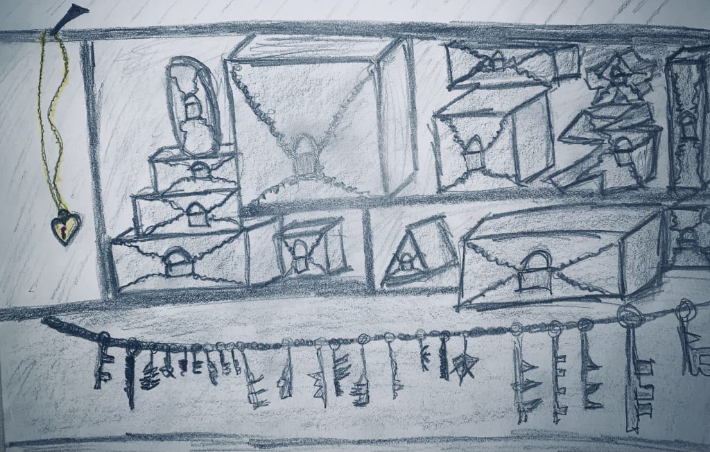 Her eyes were fixed on the locket. Her only movement was handing him the dollar. Back at the keys she closed her eyes imagining her grandma smiling at her. When her eyes opened, hanging right in front of her was the perfect little key. It even had a tiny pink set stone like the locket. Her heart almost skipped a beat.