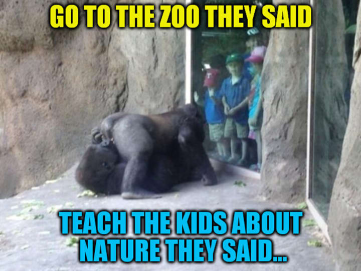Don't you love it when young children ask the most difficult questions? For instance, like, "What happens when you die?" Or, "Where do babies come from?" Well, how about when you decide to do something educational and go on a family trip to the zoo, only to witness two grown gorillas 69ing each other. How do you explain why they have their faces in each other's private parts? Or why Mr. Gorilla is trying to toss the salad for Mrs. Gorilla? Also, why are they making those weird, loud noises? This is surely to be a family memory that will last a lifetime.